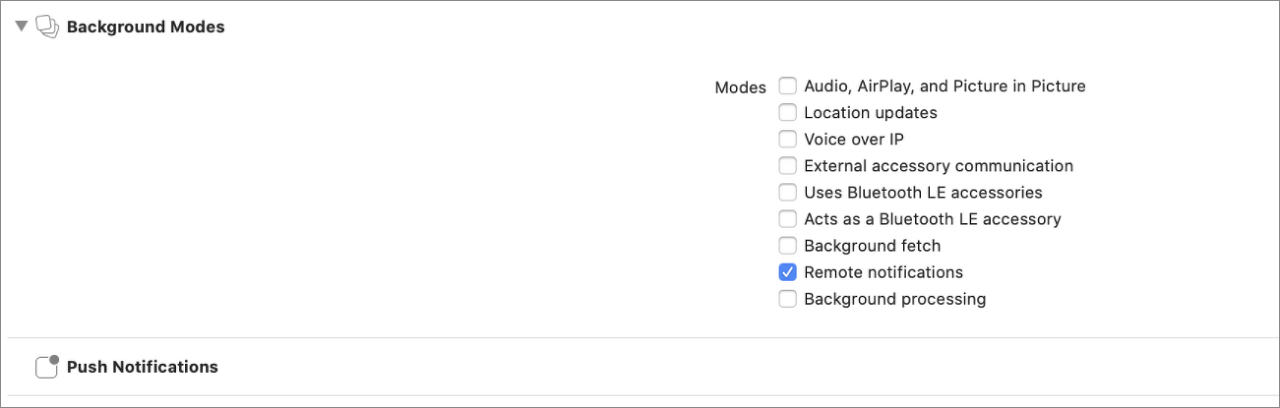 > Background Modes 선택 > Remote notification 체크