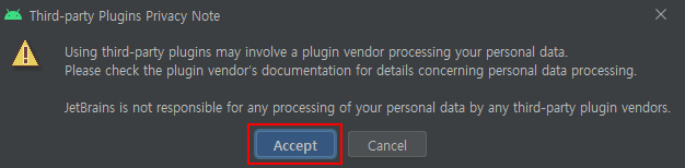 경고 문구 내용: 플러그인이 내 데이터를 처리할 수 있으며 플러그인 공급 업체에 대한 개인 데이터를 책임지지 않겠다.