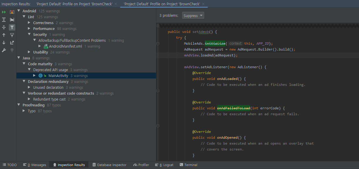1. 프로젝트 폴더 마우스 우클릭 > Analze > Inspect Code... 선택