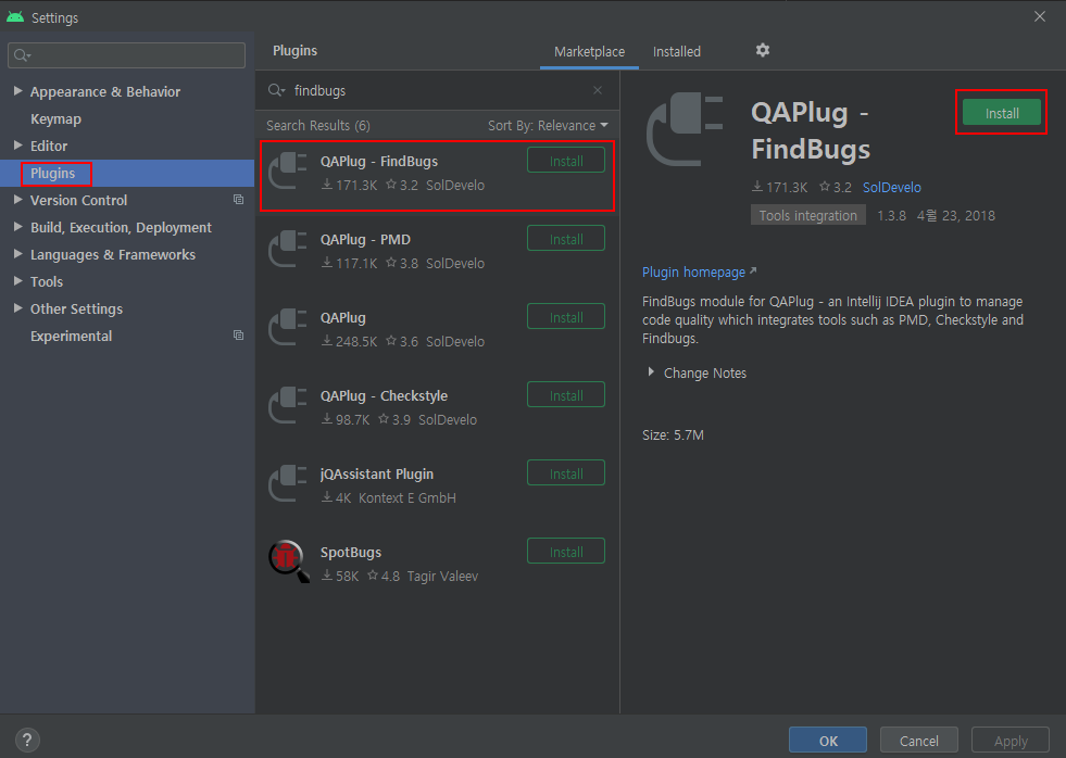 1. File > Setting > Plugins 진입 후 "FindBugs" 검색하여 "QAPlug - FindBugs" install 선택