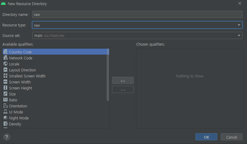 2. Resource type으로 raw 선택 후 OK를 선택한다.