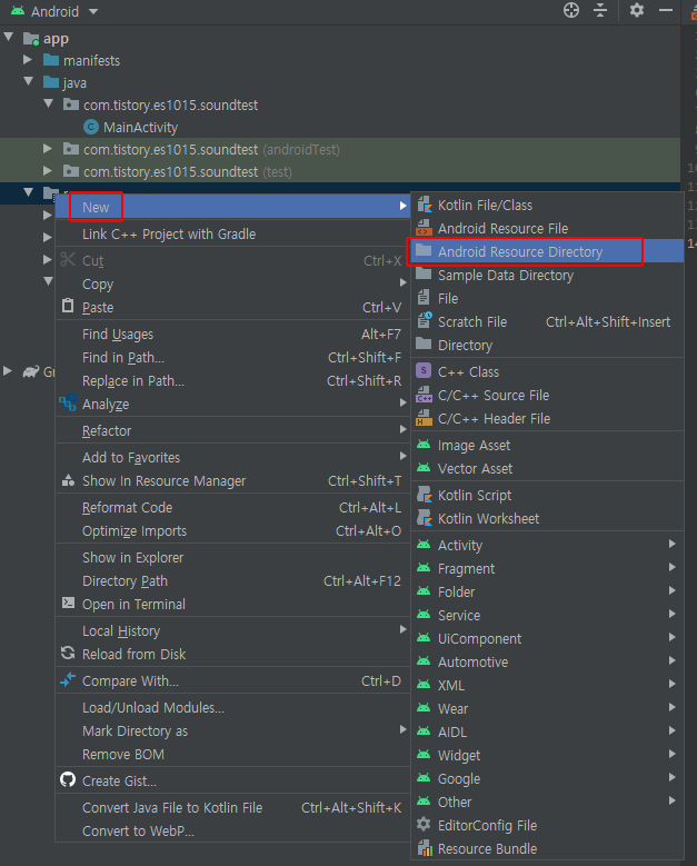res 폴더에서 마우스 우클릭 > New > Android Resource Directory