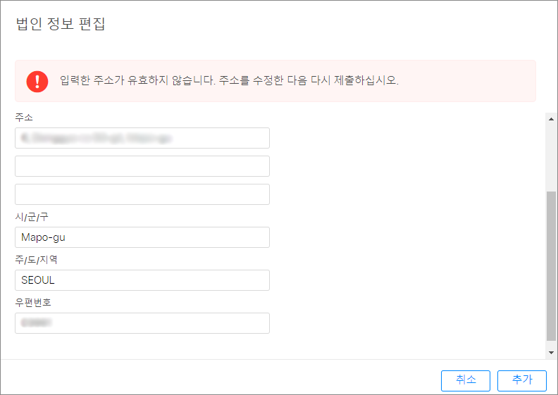 '입력한 주소가 유효하지 않습니다. 주소를 수정한 다음 다시 제출하십시오.' 에러가 발생했다.