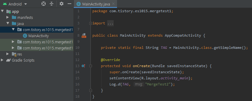 - MainActivty onCreate Log msg "MergeTest1"