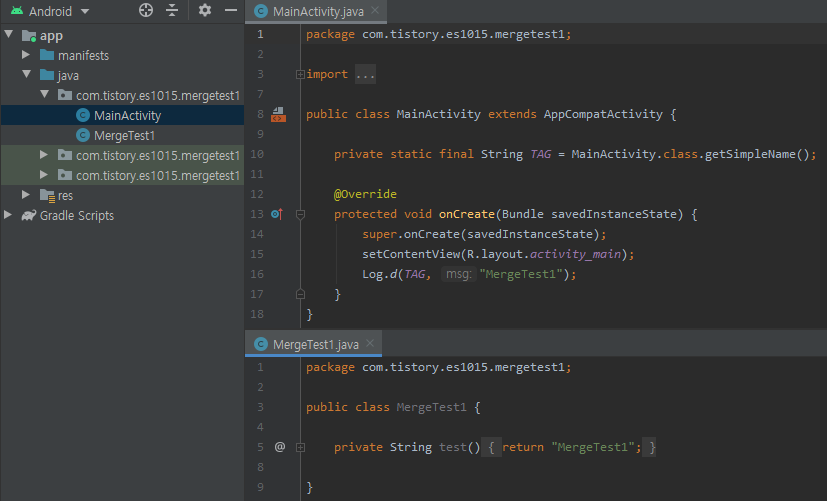 - MainActivty onCreate Log msg "MergeTest2"