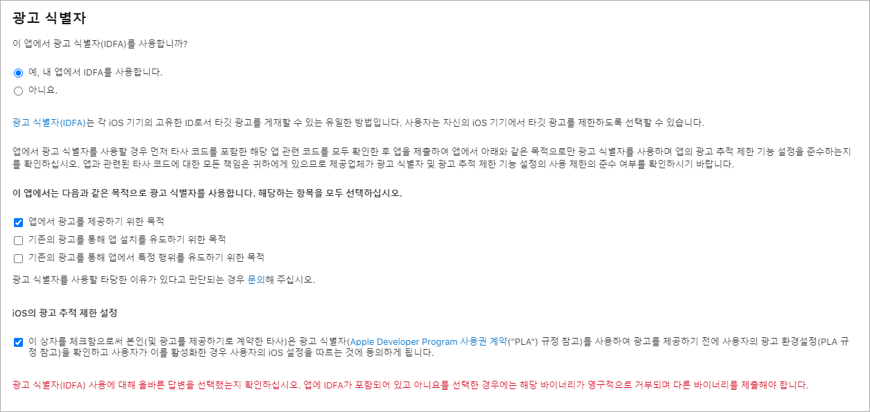 아래와 같이 App Store Connect에서 광고 식별자 부분을 잘 확인해야 한다.