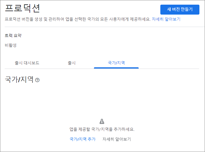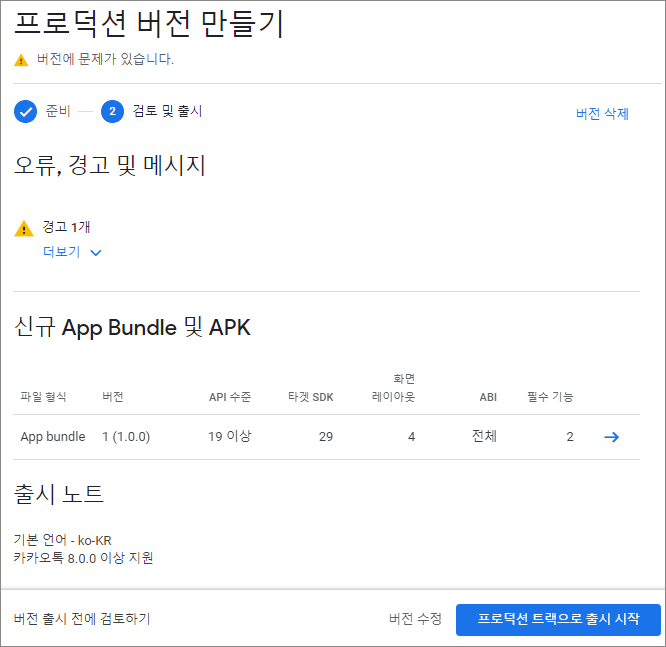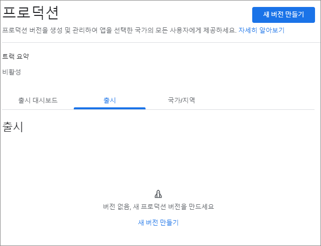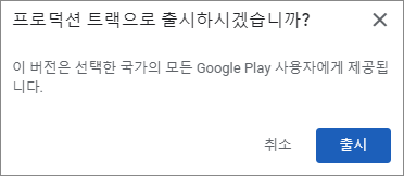버전 출시 준비가 완료되었다면 하단 오른쪽 프로덕션 트랙으로 출시 시작 선택