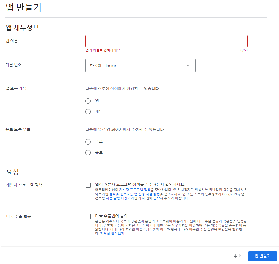 - 앱을 만들려면 요청에 있는 개발자 프로그램 정책과 미국 수출 법규는 무조건 체크해야 함