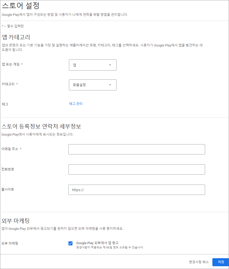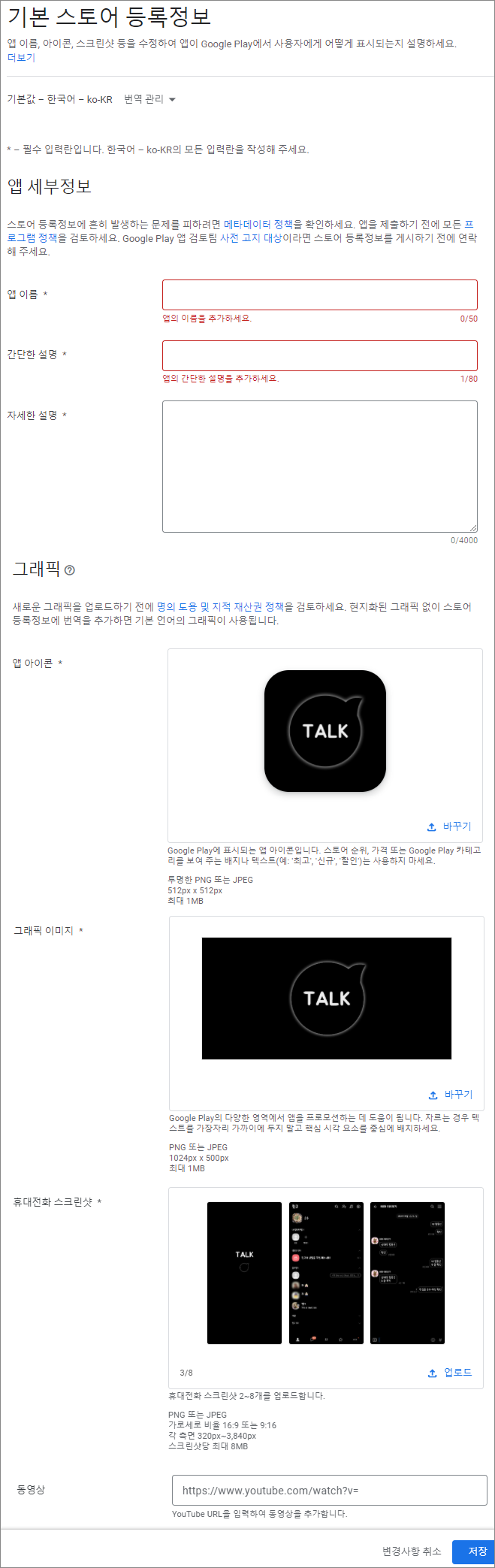 - 앱 이름, 설명, 아이콘, 스크린샷 등 준비. 아이콘과 스크린샷은 규격에 맞춰 준비