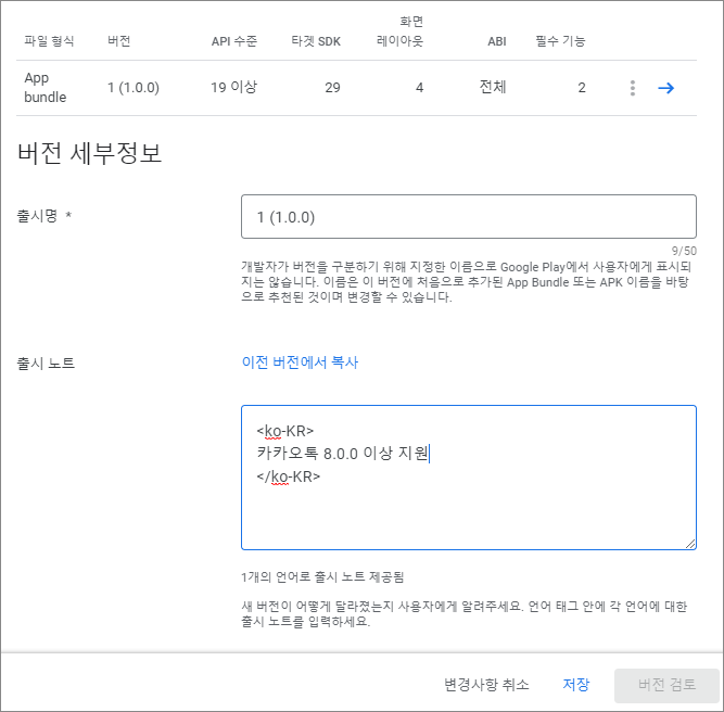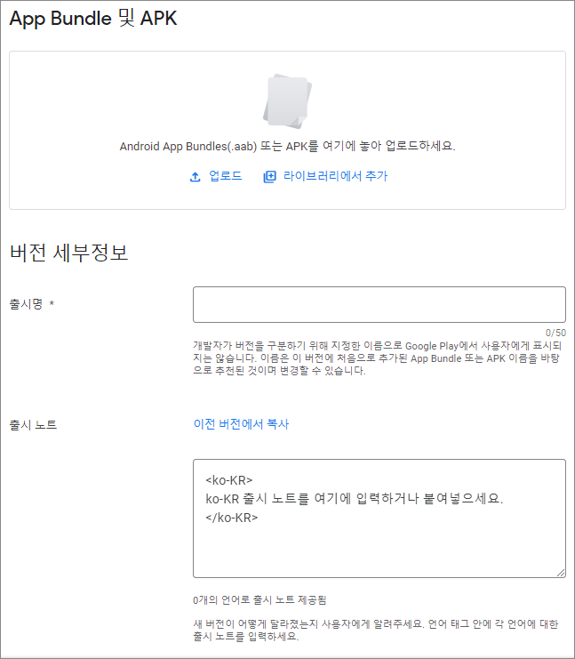 App Bundle 또는 APK 업로드하고 버전 세부 정보 입력