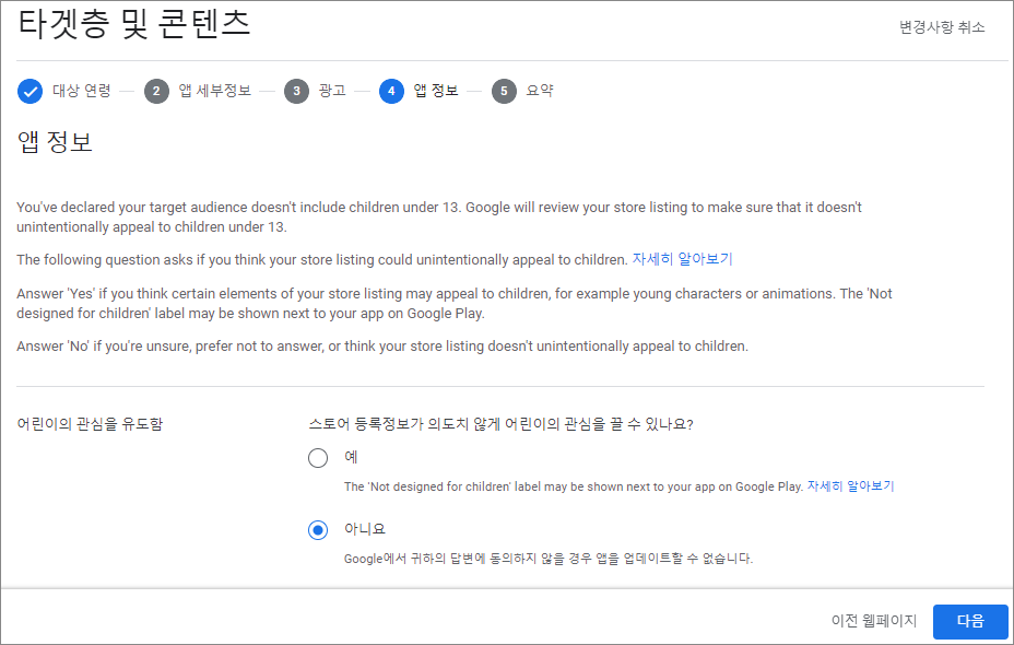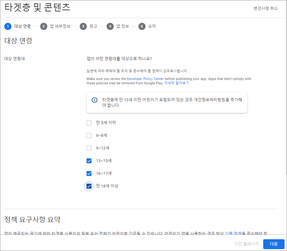 4-4-1. 타겟층을 선택하고 정책 요구사항 요약 부분 읽은 후 다음 선택