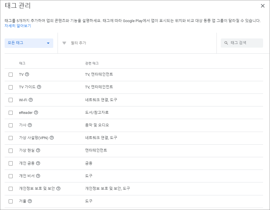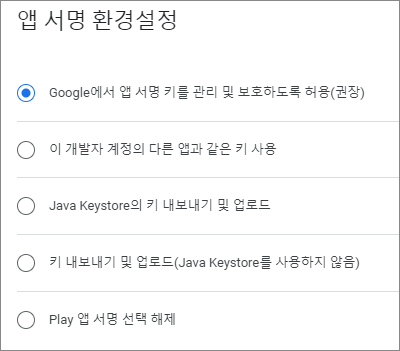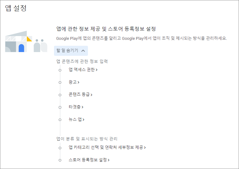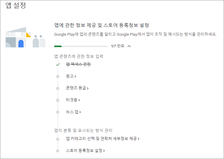 - 아래 목록 중 앱 설정과 Google Play에 앱 게시 2가지 필수