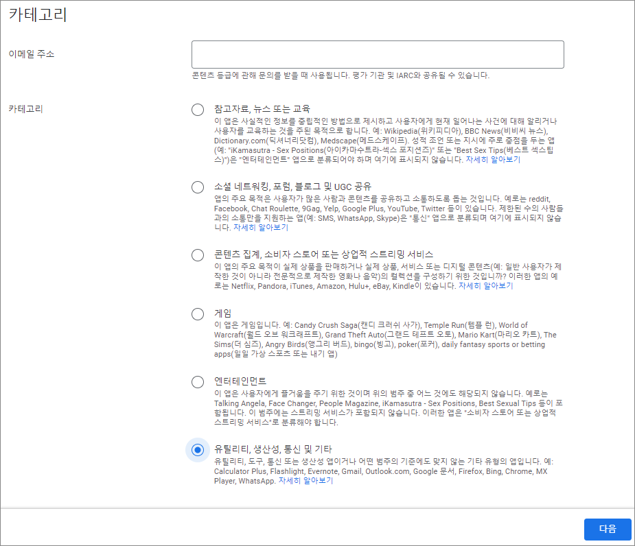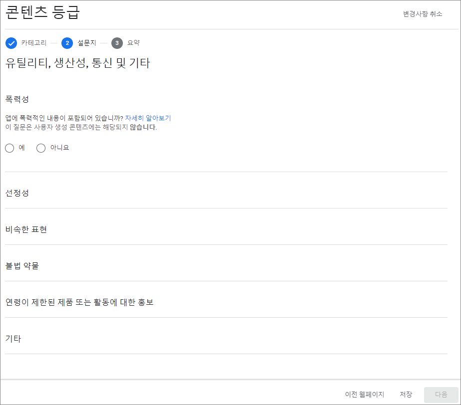 설문지는 카테고리에 따라 다르며, 나는 "유틸리티, 생산성, 통신 및 기타" 카테고리를 선택함