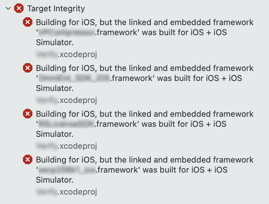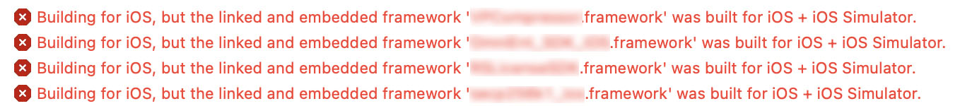 해당 오류는 framework가 iOS 실물 기기와 시뮬레이터를 모두 동작하게 하는 아키텍처를 지원하는 fat framework기 때문에 발생합니다.