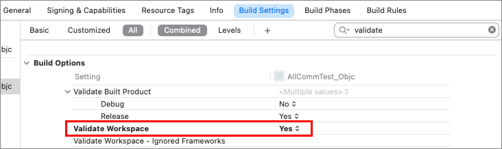 방법 2. TARGETS > Project Name > Build Setting > Build Options > Validate Workspace를 Yes 설정