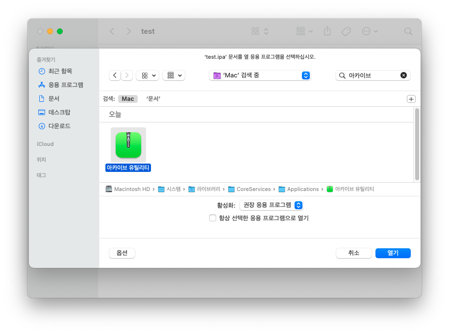- '다음으로 열기'에서 '아카이브 유틸리티'가 없는 경우: '기타...'를 선택하고 검색 화면이 나오면 '아카이브'를 검색해서 열기 진행