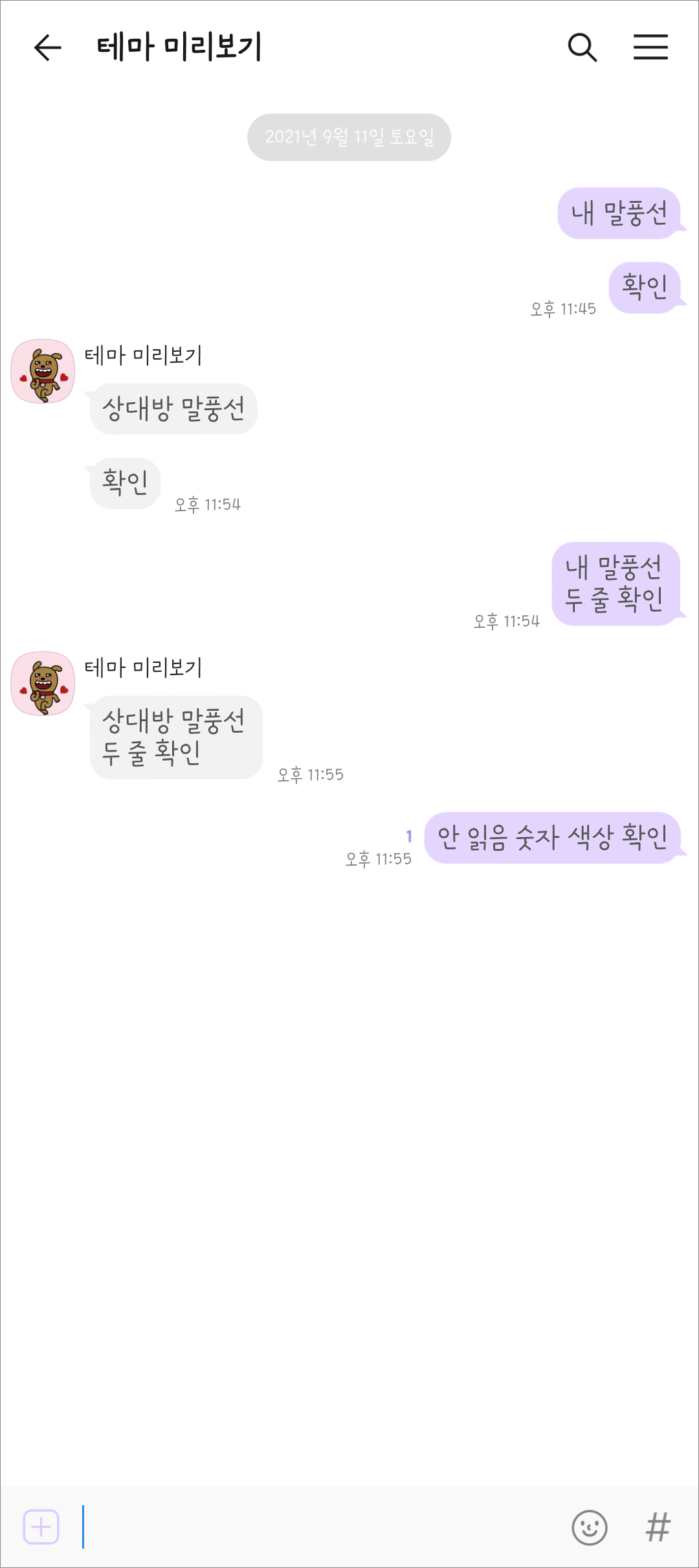 화이트 & 파스텔 보라 색상으로 제작한 심플 카톡 테마