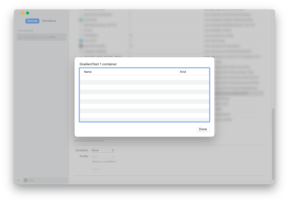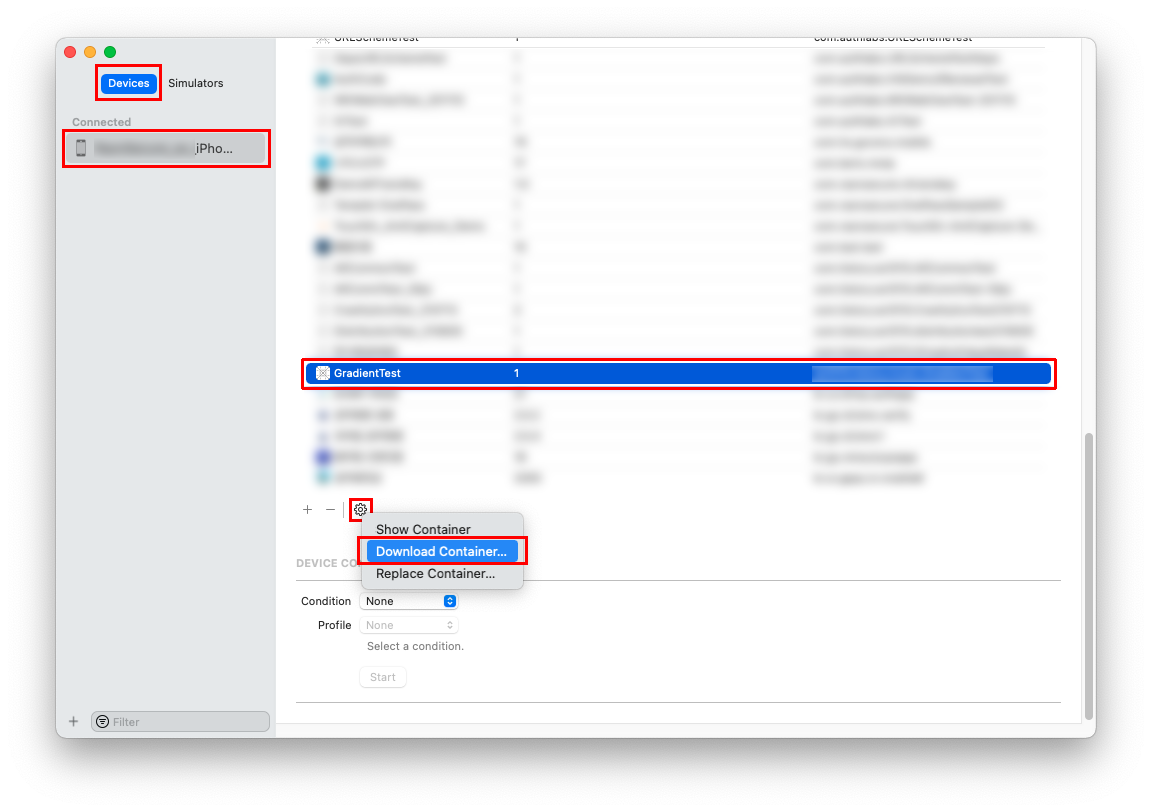 Devices and Simulators 창 > 디바이스 선택 > 프로젝트 선택 > 톱니바퀴 > Show Container 선택 시에는 아무런 데이터도 조회되지 않음