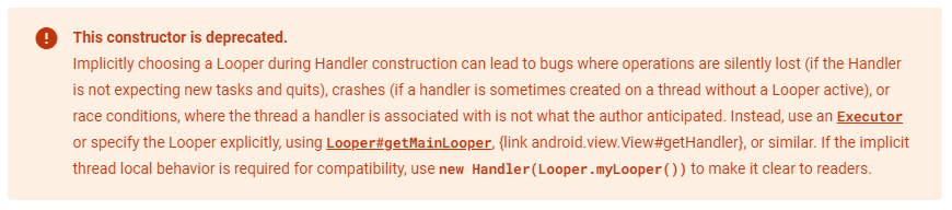 기존에는 Handler()를 선언할 때 생성자에 아무런 값도 넣지 않았지만 현재는 deprecated 되었다.