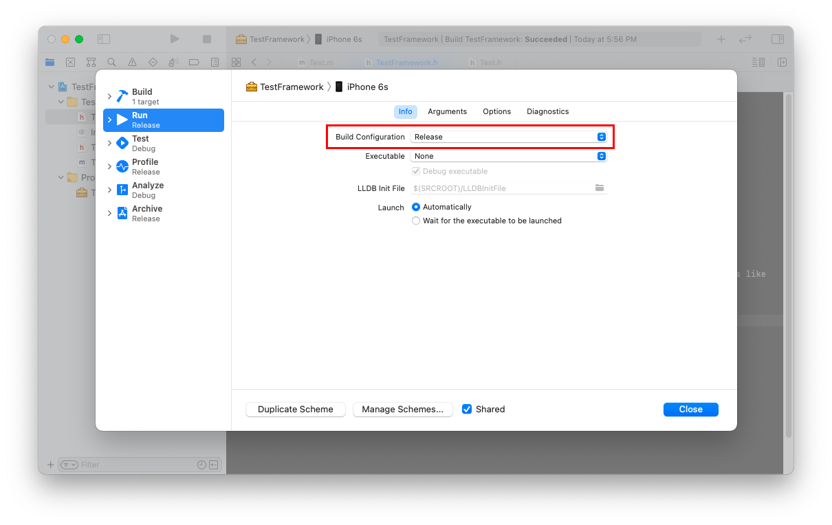 Run > Info > Build Configuration > Release 설정 후 Close