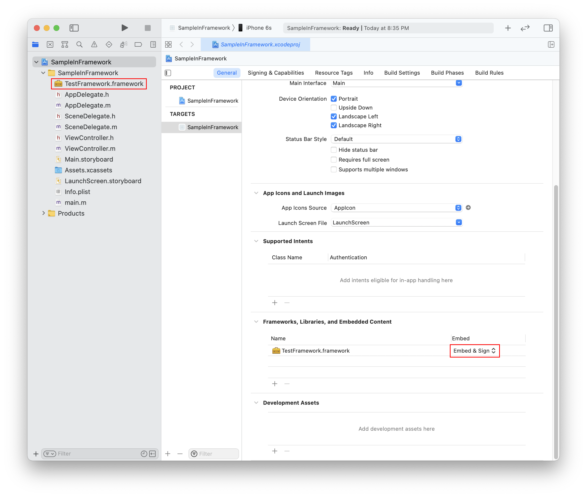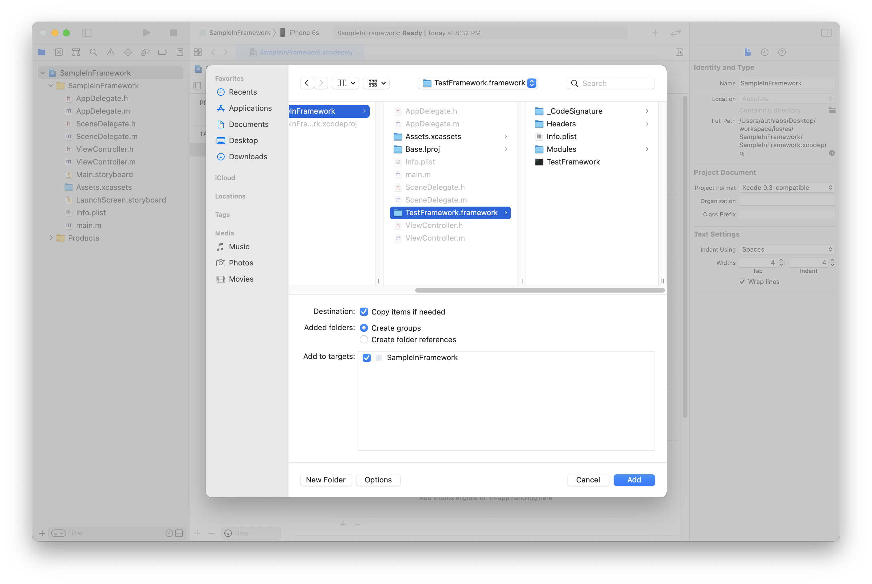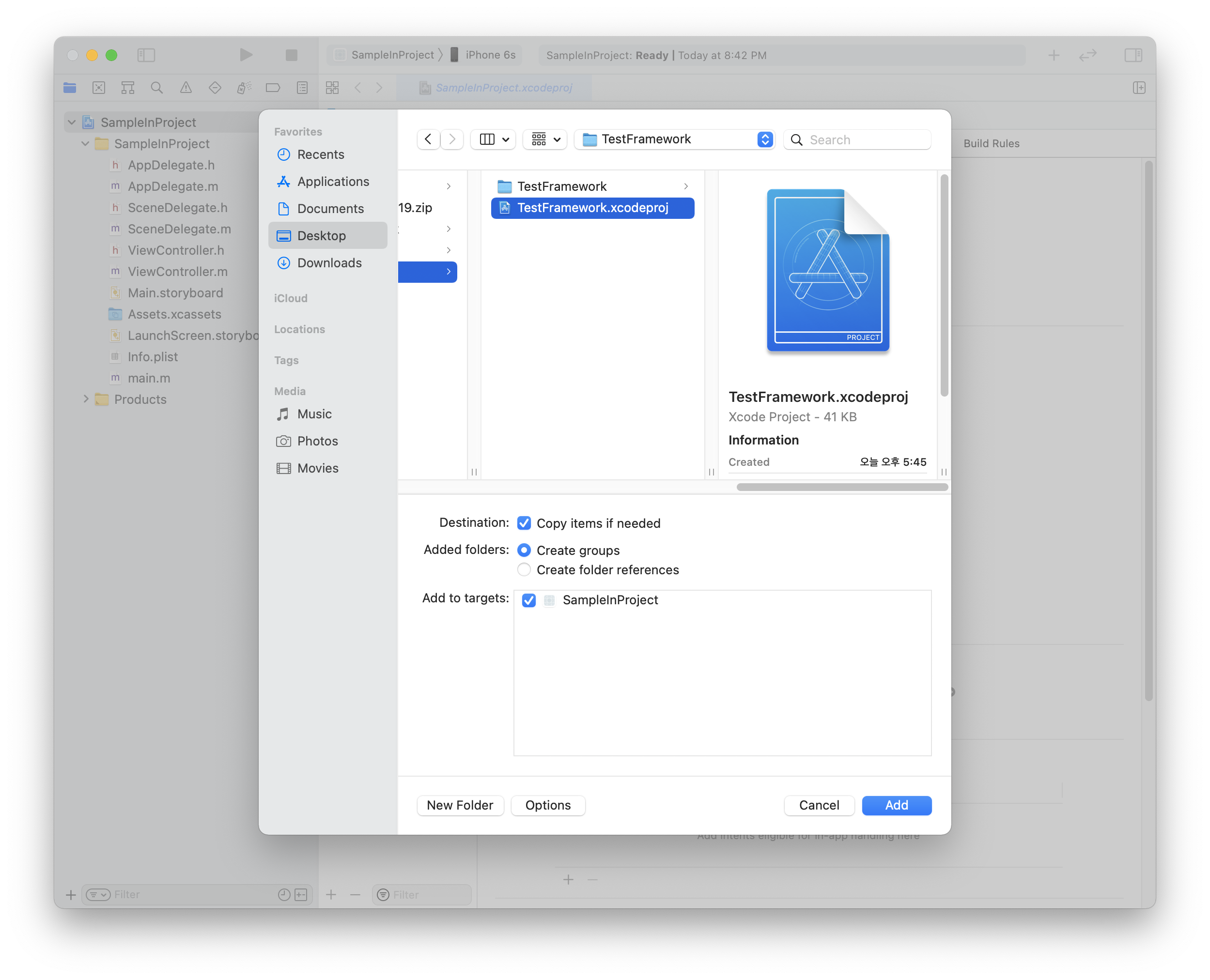 ex) SampleInFramework 프로젝트 폴더에 TestFramework.framework 파일 추가