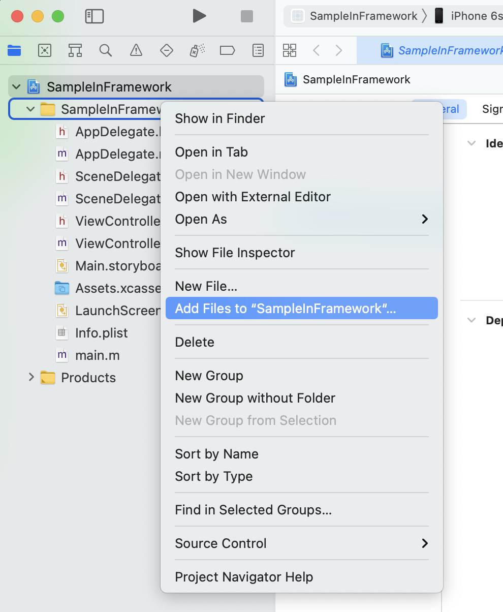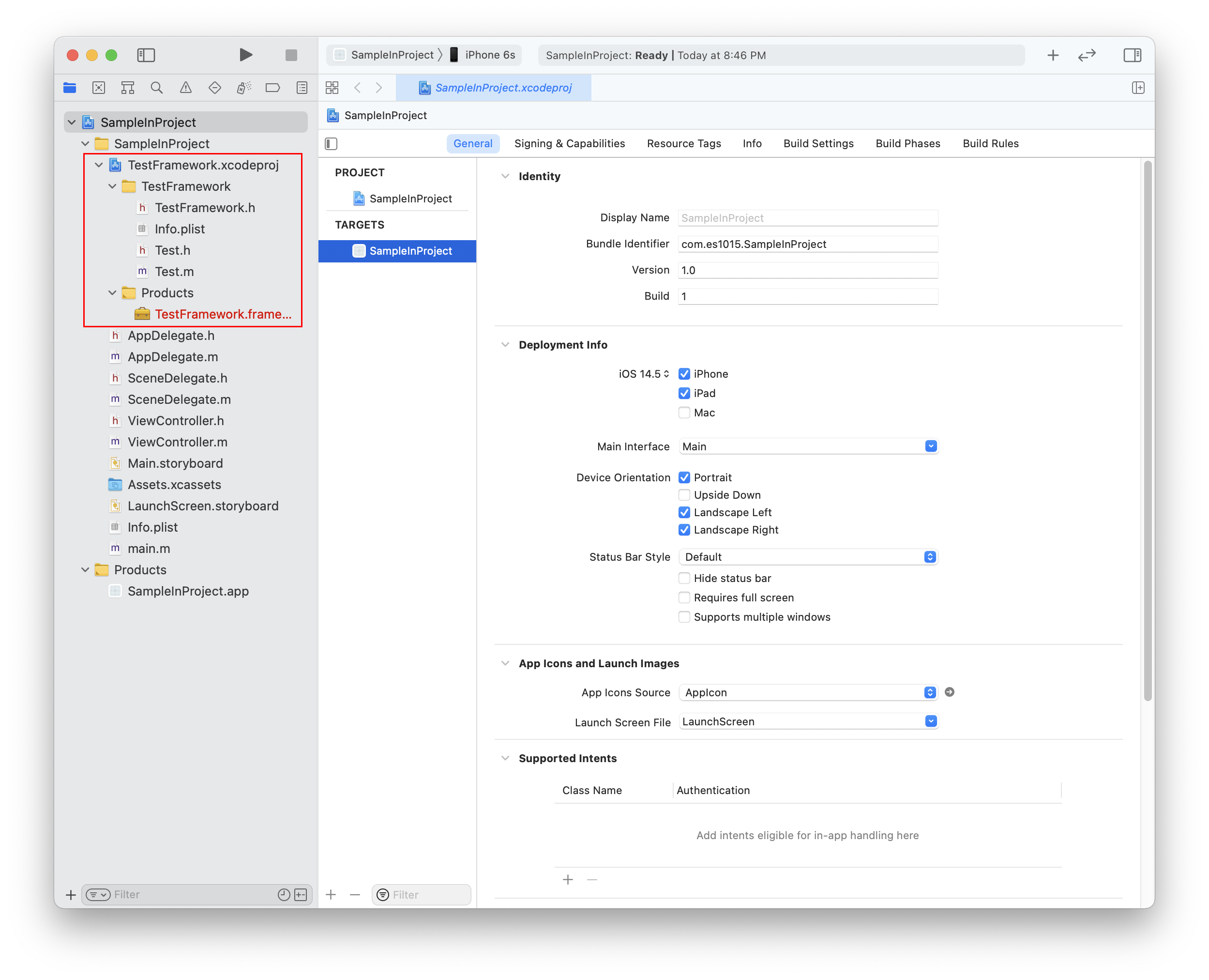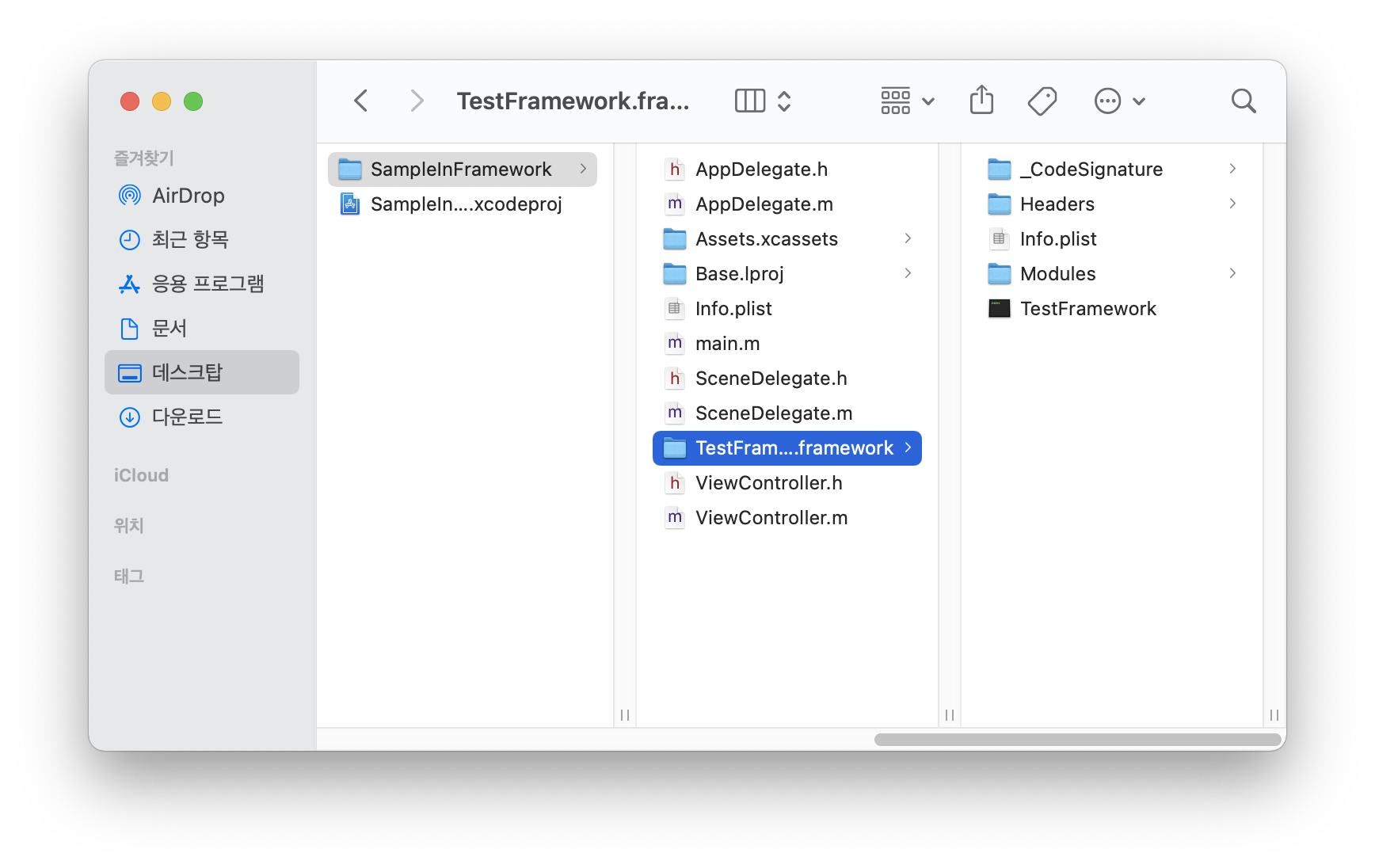 ex) SampleInFramework 프로젝트 폴더에 TestFramework.framework 파일 추가