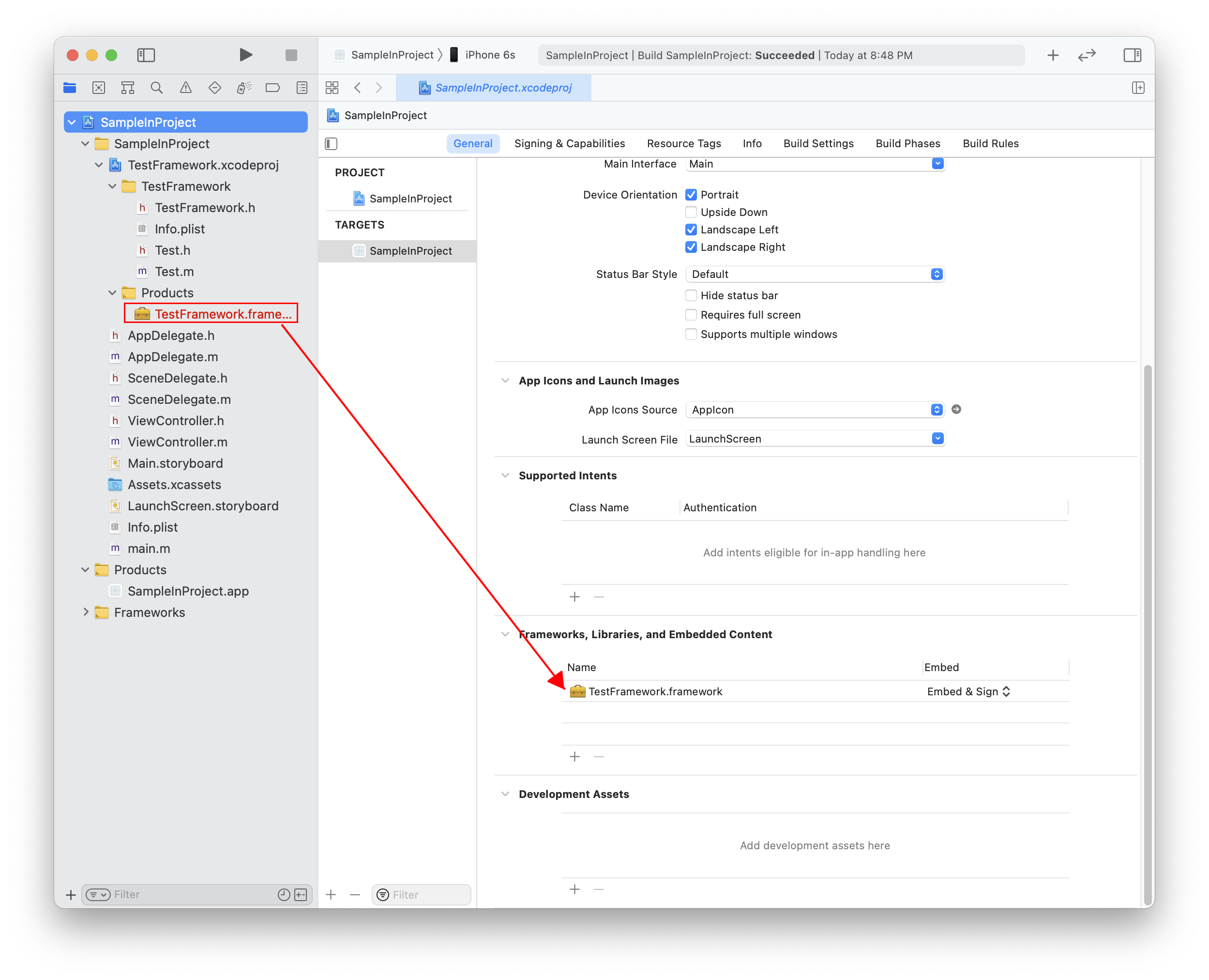 SampleInProject > TARGETS > General > Frameworks, Libraries, and Embedded Content에 드래그