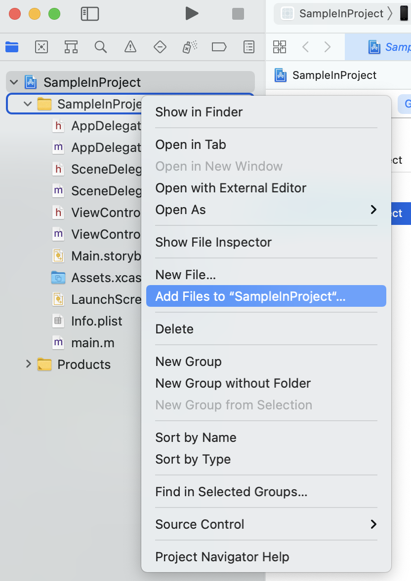2-1. 프로젝트 폴더 > 우클릭 > Add Files to "프로젝트명" > 프로젝트 파일(.xcodeproj) 선택 후 Add