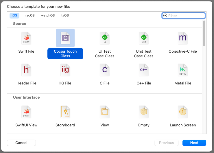 1-1. Xcode File > New > File > Cocoa Touch Class 선택