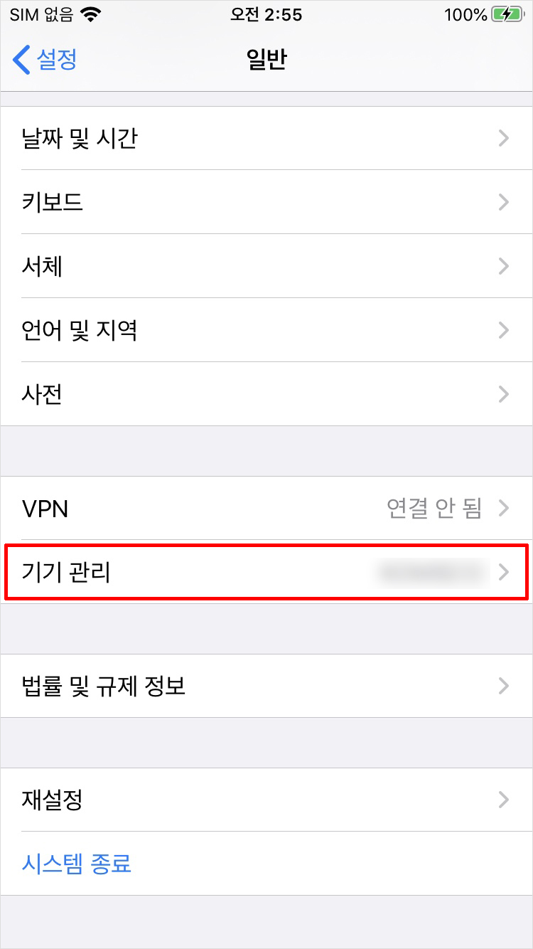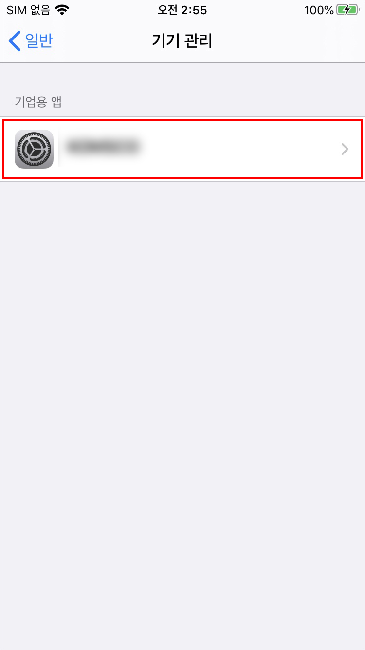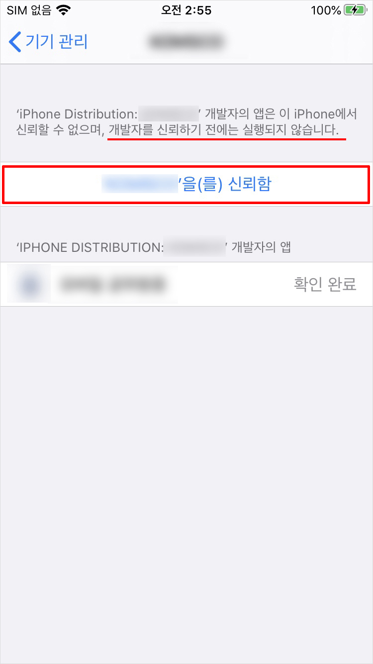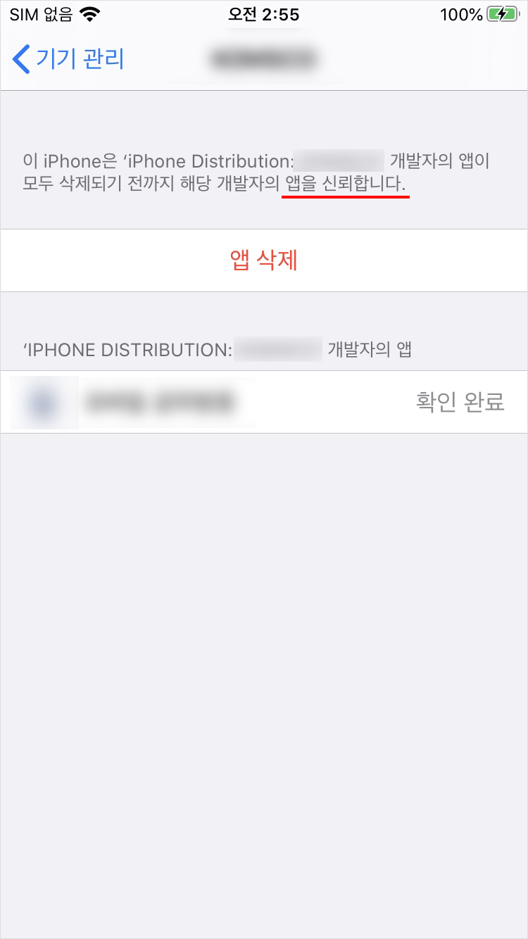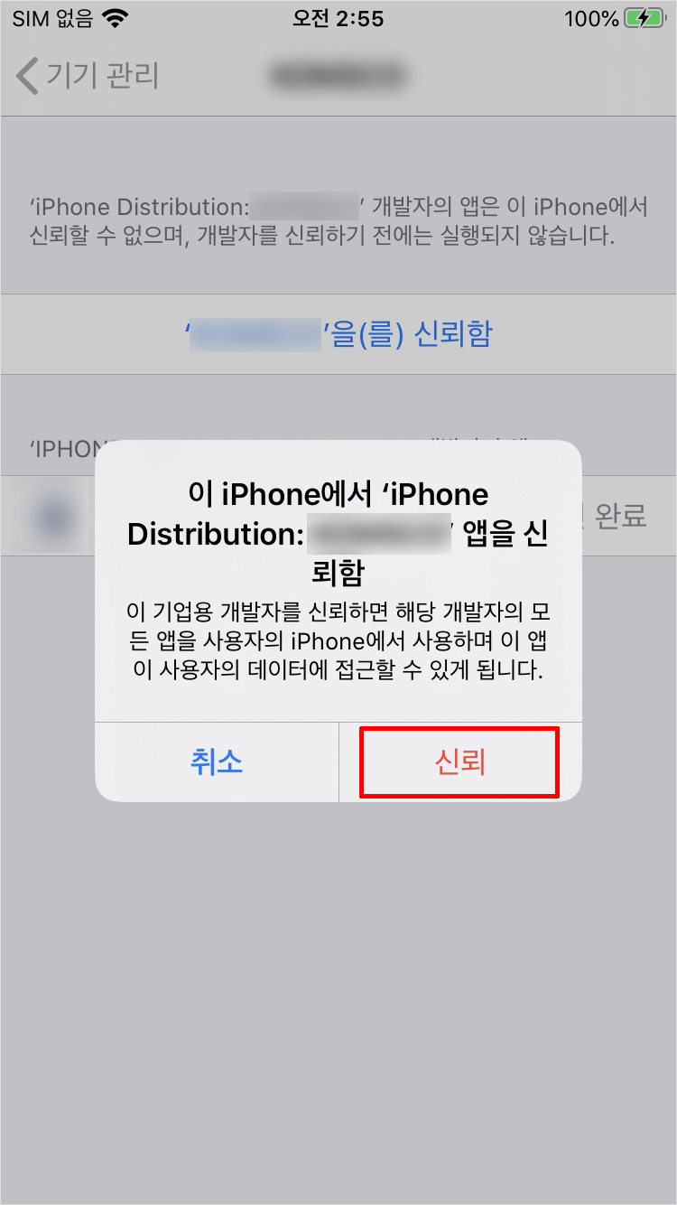 기업용 앱(기업에서 배포한 앱) 설치 후, 실행을 위해 신뢰를 설정해야 앱 사용이 가능하다.