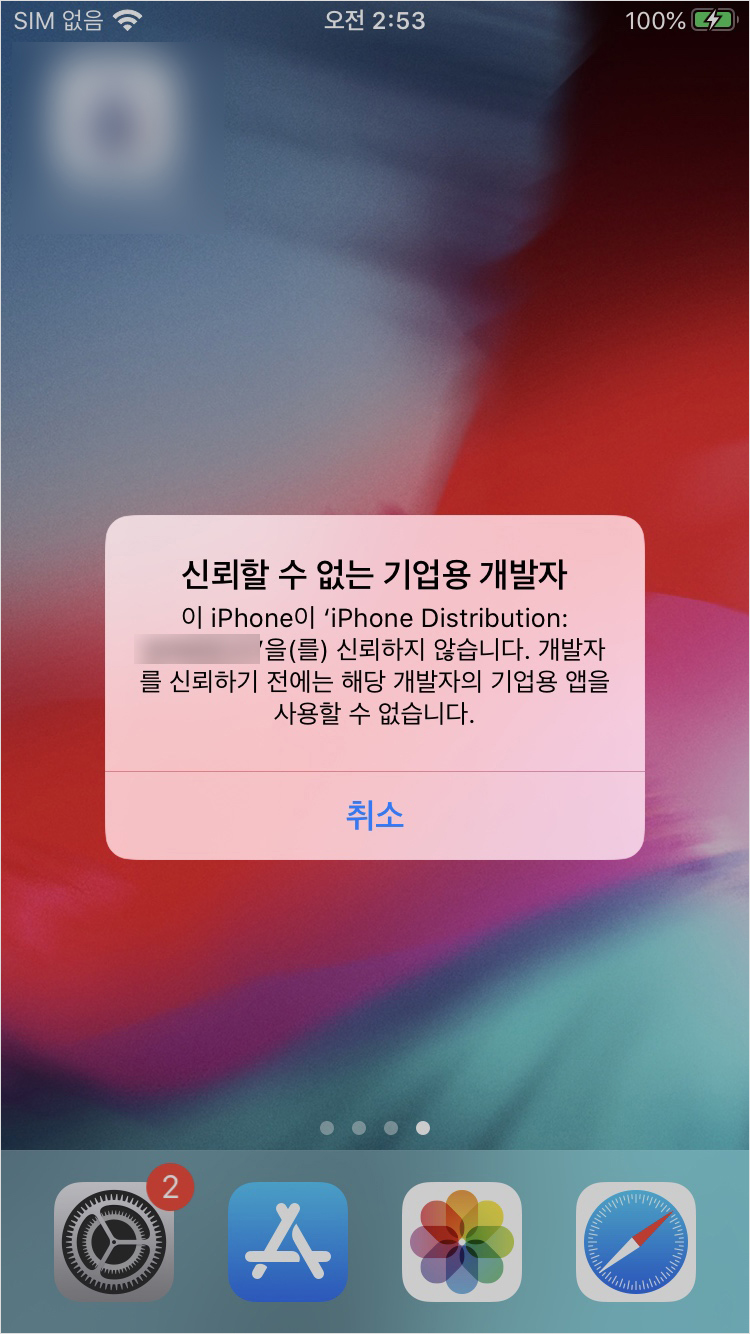 신뢰하지 않은 경우는 아래 알림이 뜨면서 앱 실행이 불가능하다.