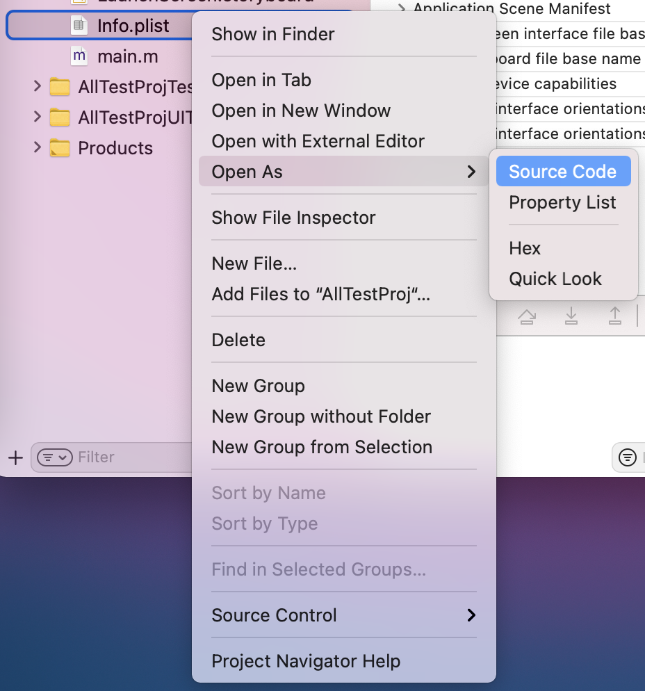 Info.plist 우클릭 > Open As > Source Code 선택