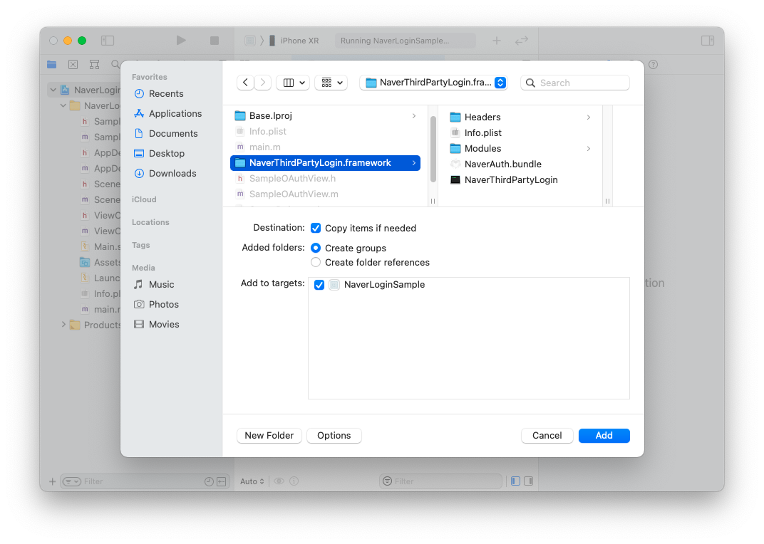 ※ framework 파일 추가 또는 pod 설치 방법이 있으며, 해당 글에서는 Naver Github 샘플에서 가져온 framework(NaverThirdPartyLogin.framework) 파일을 사용합니다.