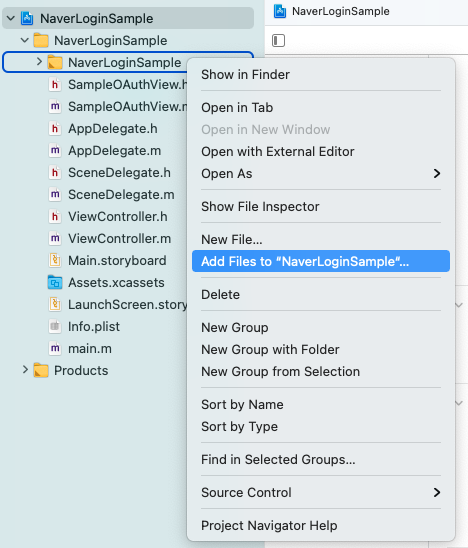샘플 프로젝트에 있는 SampleOAuthView.h.m 파일 추가