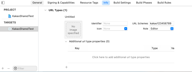 프로젝트 > TARGETS > Info > URL Types > URL Schemes 항목에 네이티브 앱 키(Native App Key)를 'kakao{NATIVE_APP_KEY}' 형식으로 추가합니다.