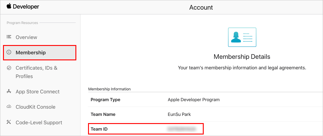 Team ID는 Membership 화면에서 확인 가능합니다.