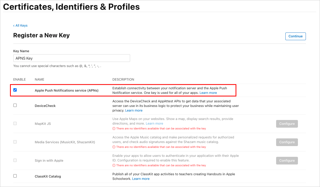 3. Key Name 입력 및 Apple Push Notification service (APNs) 체크 후 Continue