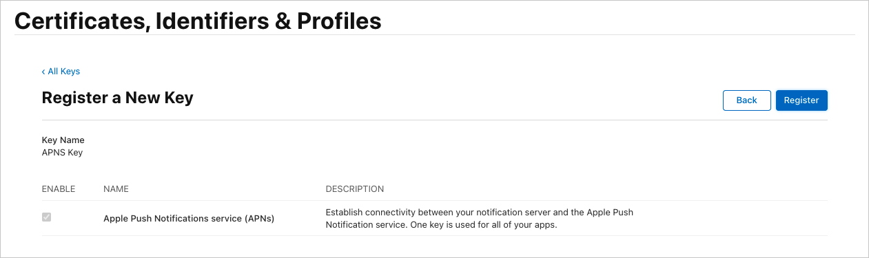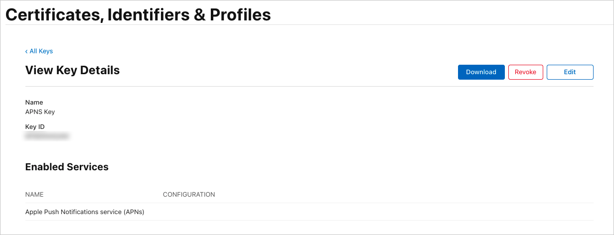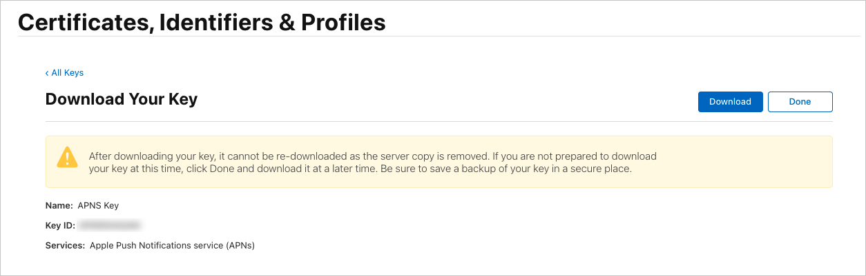 때문에 키를 다운로드한 후 안전한 곳에 백업해두어야 합니다. - 계정 당 APNS 키는 최대 2개만 발급 가능합니다.
