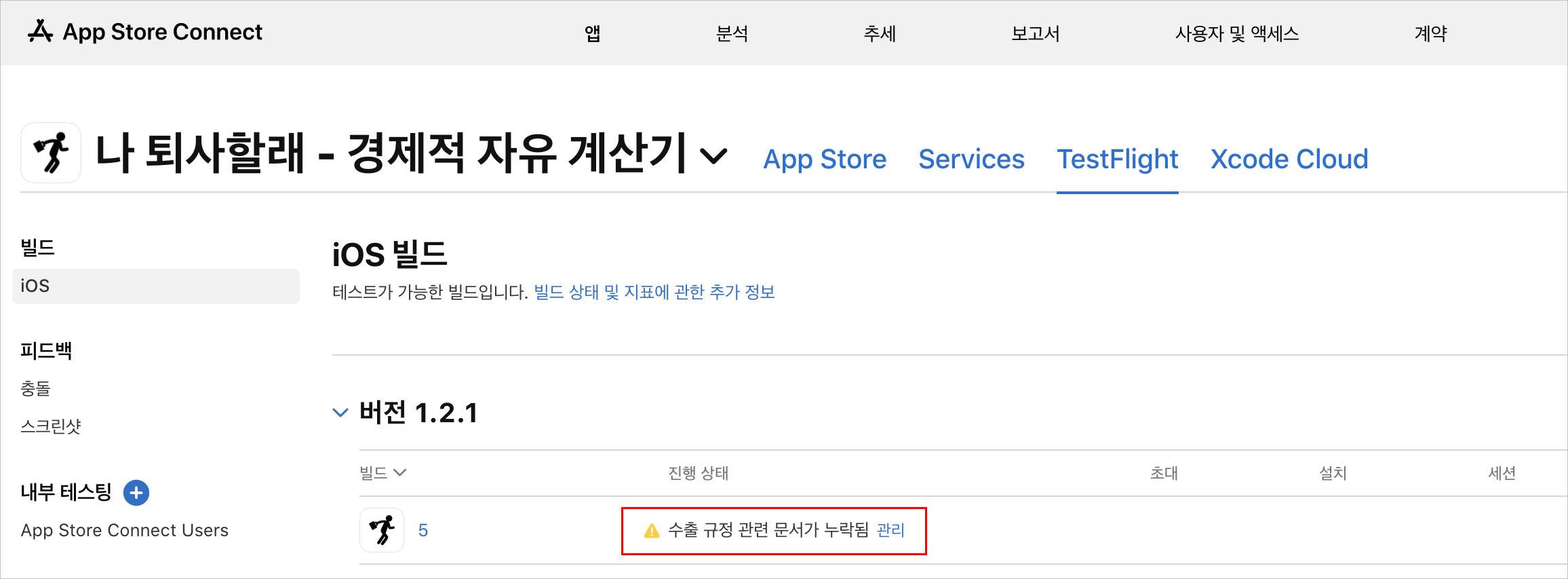 TestFlight 업로드 시 진행 상태에 '수출 규정 관련 문서가 누락됨(Missing Compliance)'이라고 아래와 같이 출력되는 경우가 있습니다.