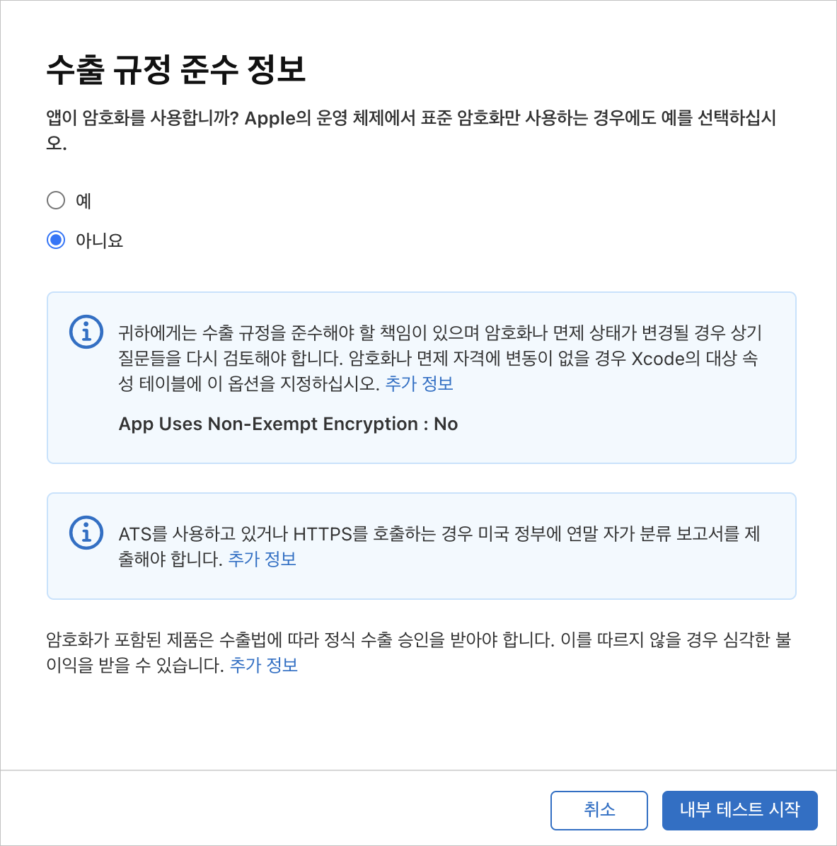 앱에서 암호화를 사용하는지 여부를 묻는것인데, TestFlight(AppStore)에 업로드 시마다 물어봅니다!