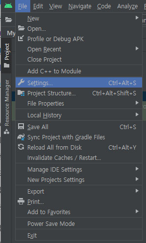 1. Android Studio 상단 메뉴 > File > Settings... (Ctrl+Alt+S) 선택