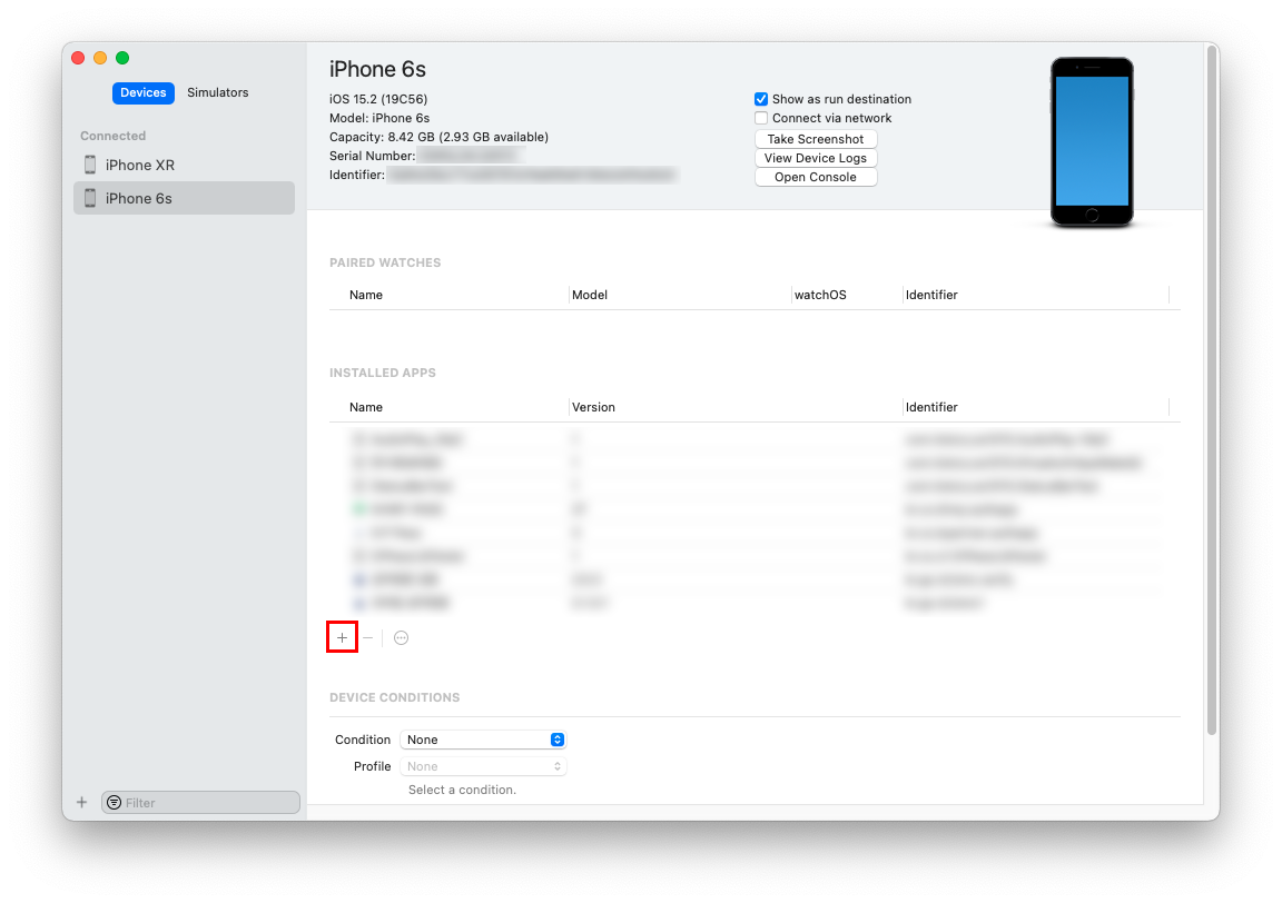 2. ipa를 설치할 디바이스를 선택하고 INSTALLED APPS 하단 + 버튼을 선택합니다.
