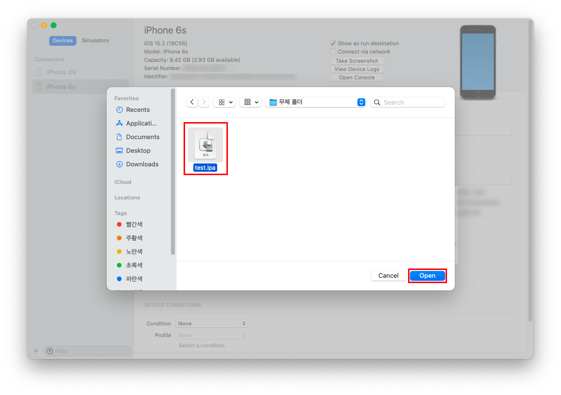 3. 설치할 ipa 파일을 선택 후 Open을 선택합니다.