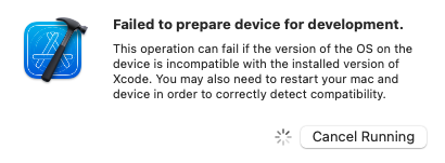 | Failed to prepare device for development. This operation can fail if the version of the OS on the device is incompatible with the installed version of Xcode. You may also need to restart your mac and device in order to correctly detect compatibility. |