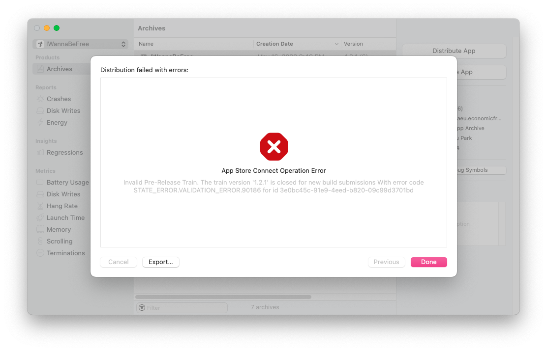 => 오류 내용: Invalid Pre-Release Train. The train version '1.2.1' is closed for new build submissions With error code STATE_ERROR.VALIDATION_ERROR.90186 for id 3e0bc45c-91e9-4eed-b820-09c99d3701bd