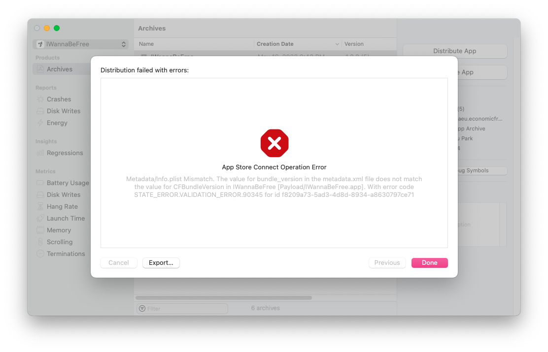 => 오류 내용: Metadata/Info.plist Mismatch. The value for bundle_version in the metadata.xml file does not match the value for CFBundleVersion in IWannaBeFree [Payload/IWannaBeFree.app]. With error code STATE_ERROR.VALIDATION_ERROR.90345 for id f8209a73-5ad3-4d8d-8934-a8630797ce71