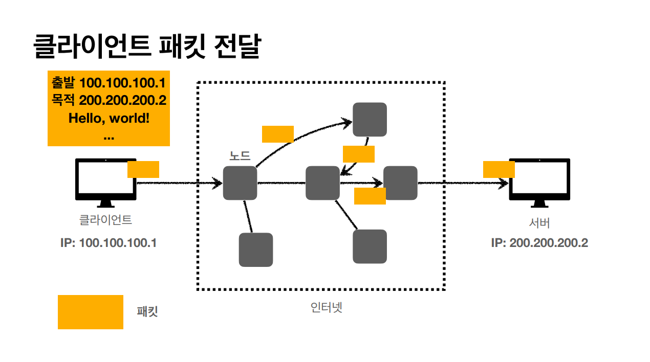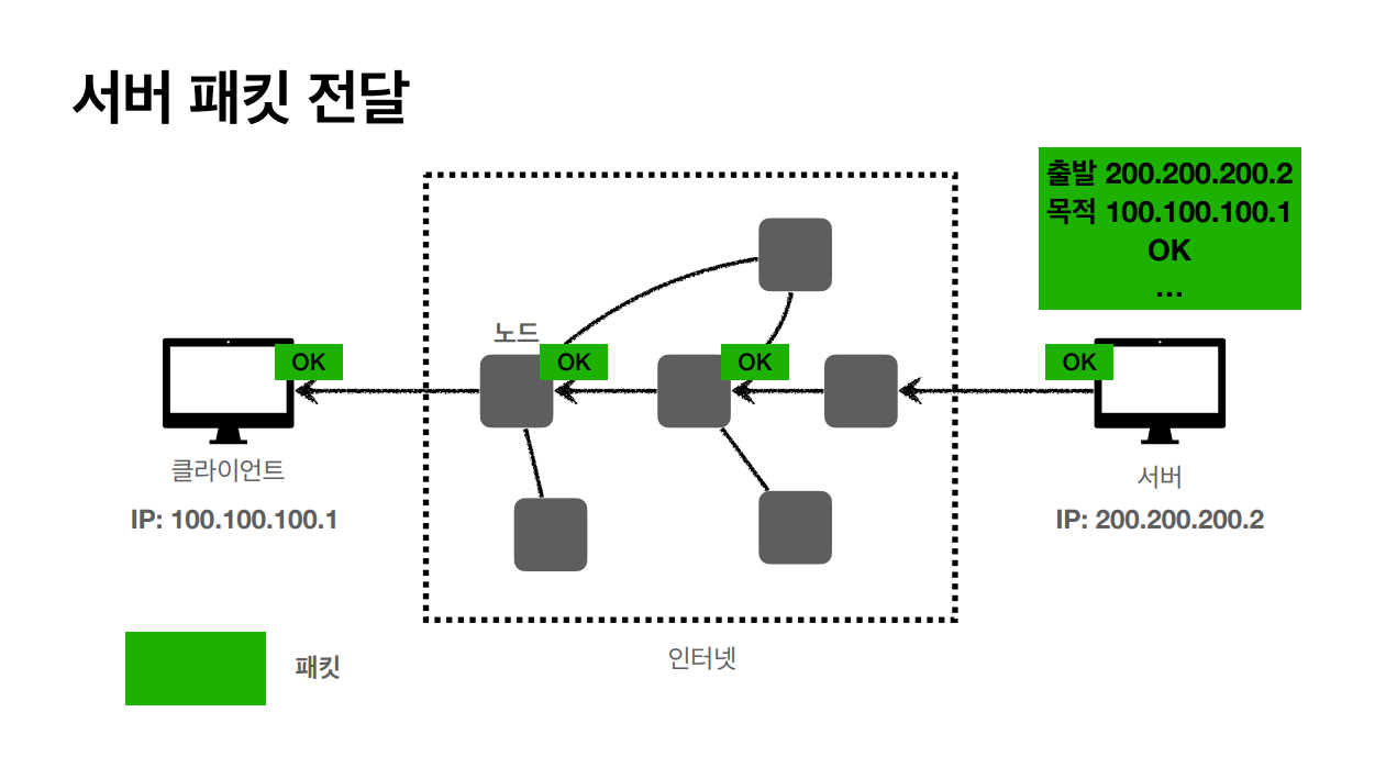 ◾ 출발지 IP, 목적지 IP, 메시지 등을 넣어 IP 패킷을 만들어 노드를 통해 서버에 전달