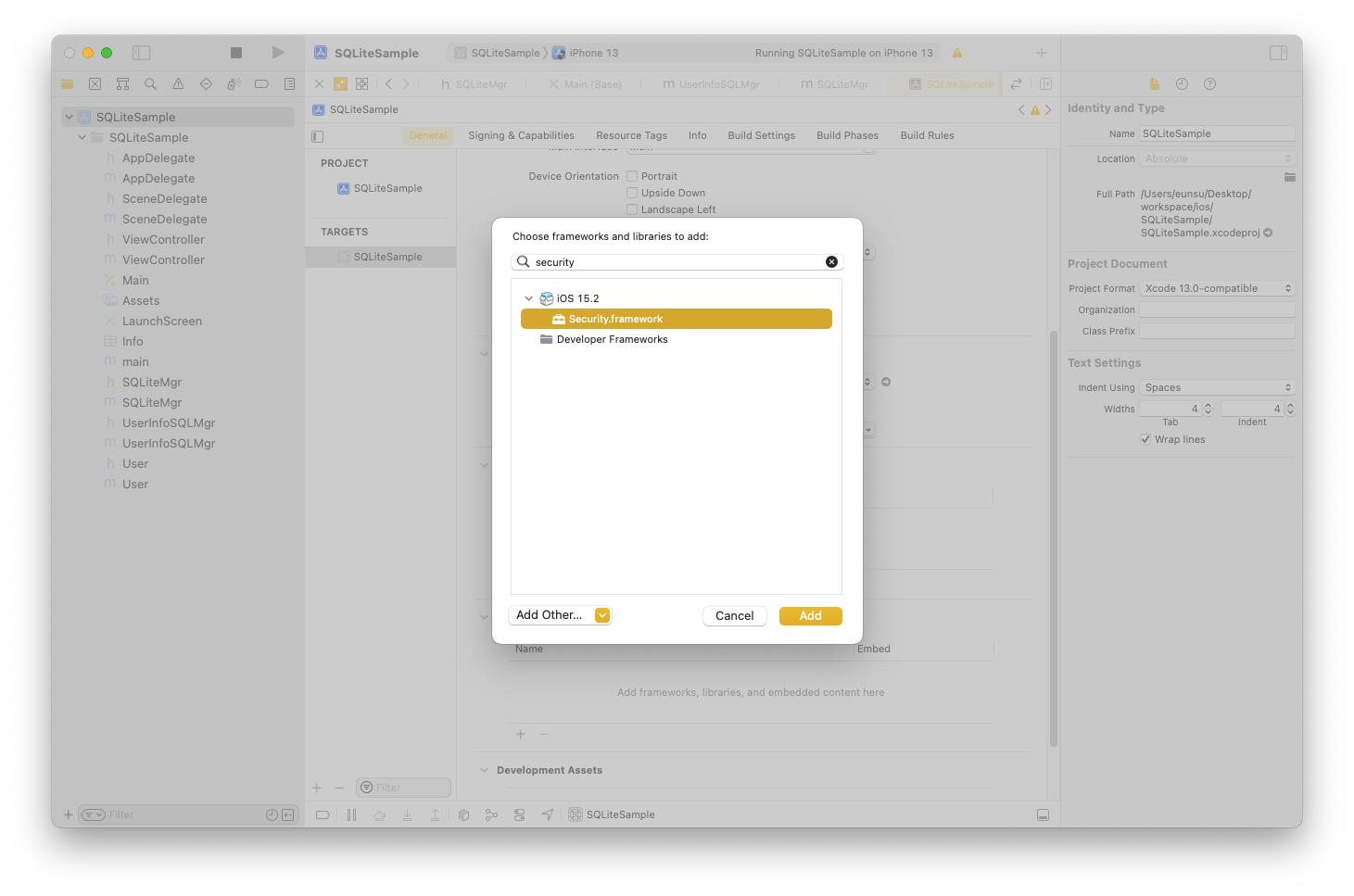 Project > TARGETS > General > Frameworks, Libraries, and Embedded Content 이동 후 Security.framework 추가
