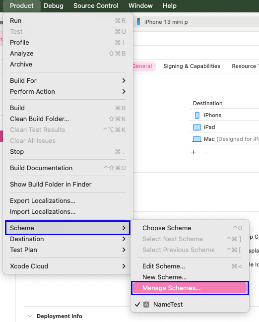 2-1. Xcode > Product > Scheme > Manage Schemes... 선택