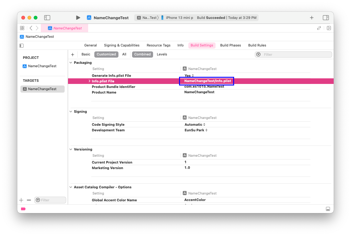 5-1. TARGETS > Build Settings > Packaging > Info.plist File > 선택 후 변경된 프로젝트명으로 변경
